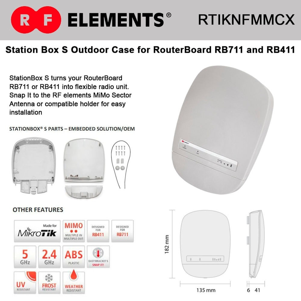 Outdoor enclosure for RB911, RB912, RB711, RB411, made of ABS plastic, up to two N-female terminals, visible LEDs, mechanically compatible to RF elements MiMo Sectors, also to wide range of UBNT antennas (High Gain AirMax Sectors, Dishes and Omni). StationBox® S with two preinstalled N-female to MMCX pigtails.